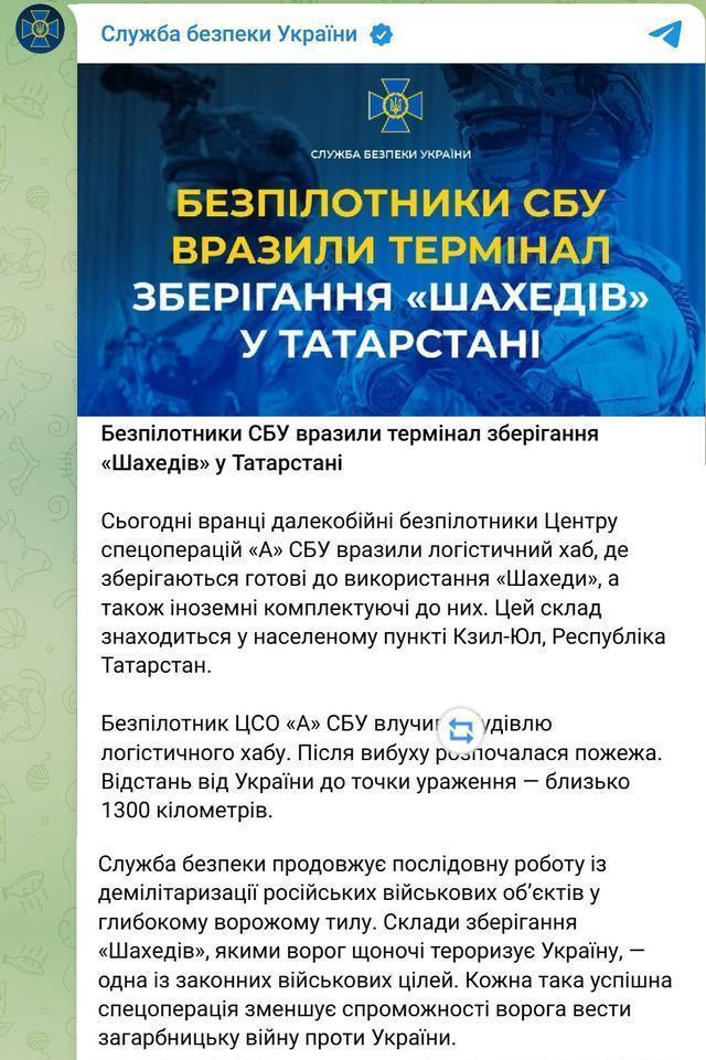 乌克兰安全局证实,这次袭击是由其部队实施的。 该局在电报频道发布的声明说:“乌克兰无人机袭击了鞑靼斯坦的Shahed的生产和存储设施。8月9日,SSUAlphaSpecialGroup远程无人机袭击了设置在鞑靼斯坦机场航站楼的一个无人机仓库,以及军用物流中心和制造厂。该仓库储存大量即用型Shaheds成品和外国部件”。